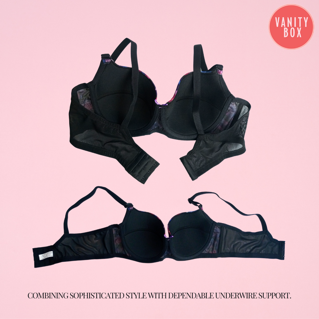 Underwire full cup bra in printed powernet, back panels in black powernet